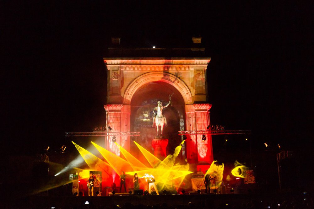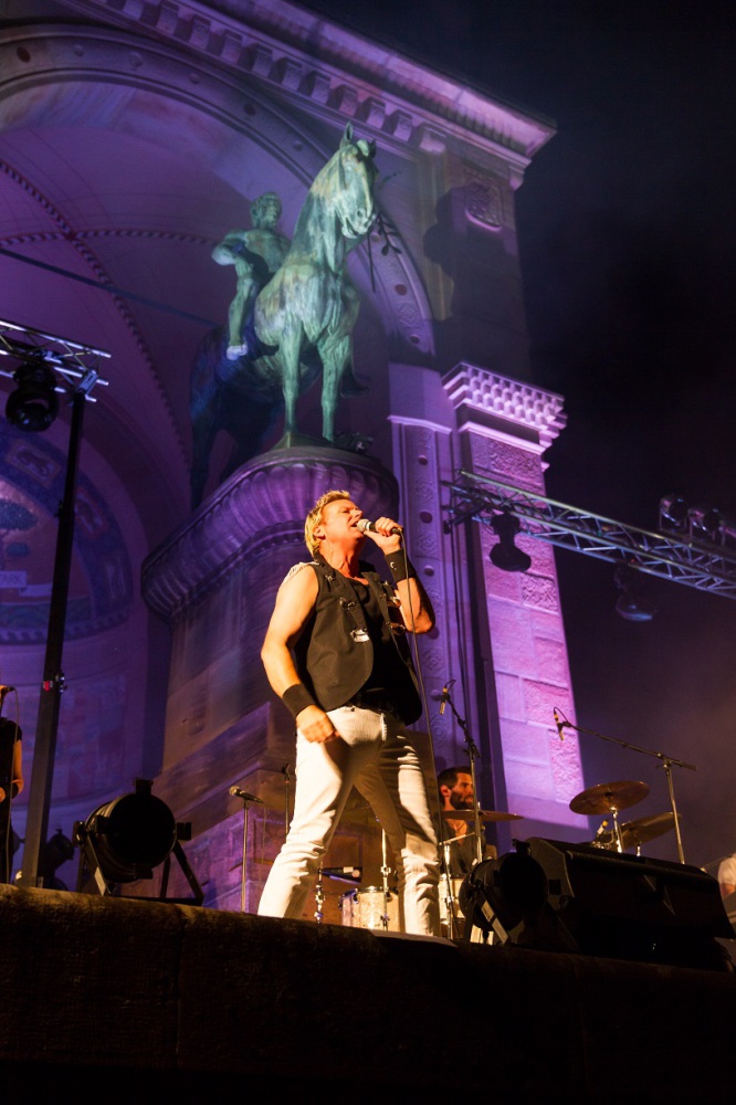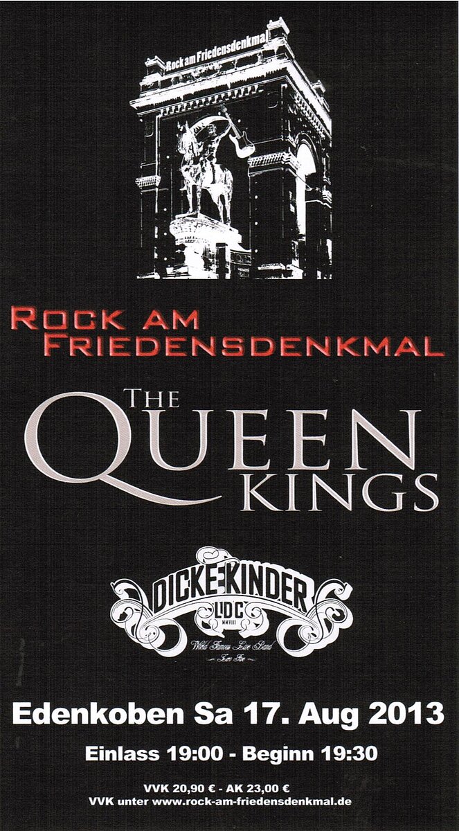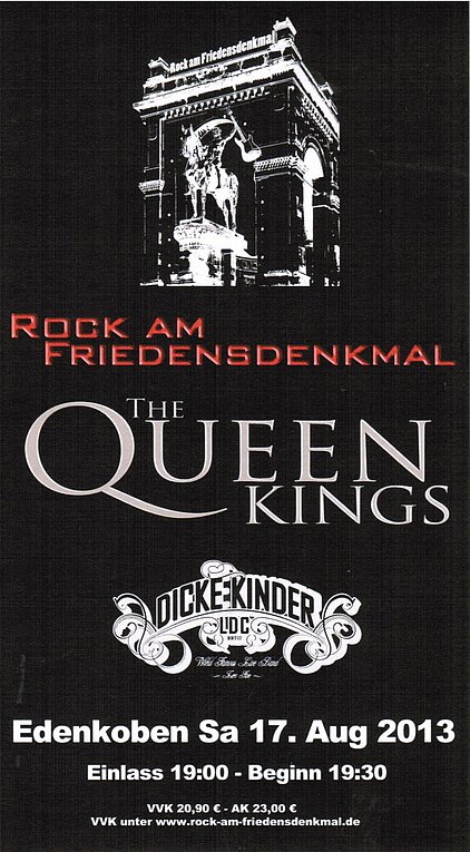 The Queenkings waren zum zweitenmal da, und es war restlos ausverkauft - wer hätte das gedacht!? Die Lightshow war besser als je zuvor, denn jedes Detail des Denkmals wurde ausgeleuchtet. Mit einem bunten Repertoire durch die Rockaera sorgten Die Dicken Kinder von Landau vorab für die richtige Atmosphäre.